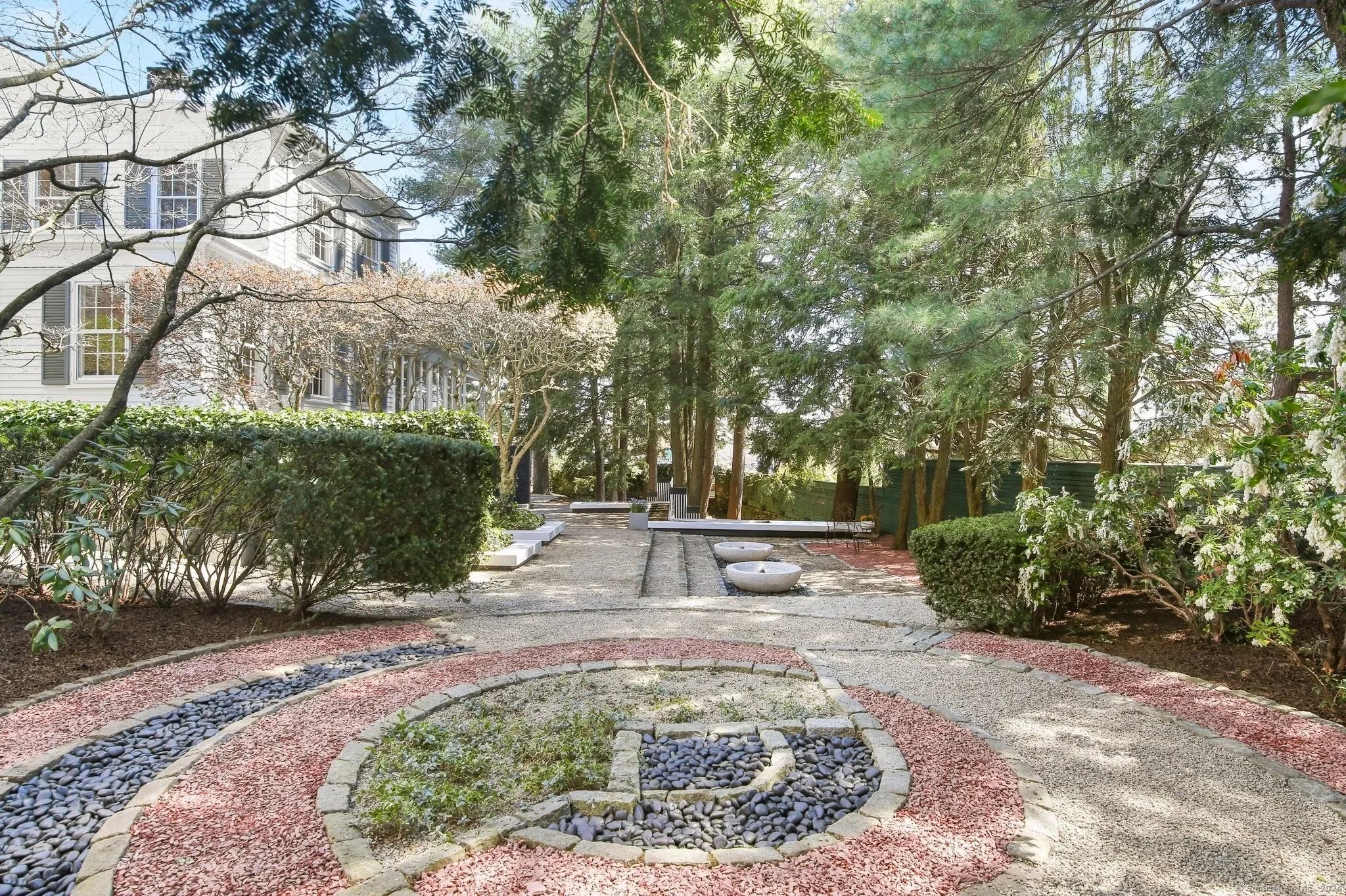 Former owner Richard Bergmann, a noted landscape architect and sculptor, designed a modernist garden featuring stepped terraces and preserved the hemlock grove planted by Louise Perkins.The gardens are included in the Smithsonian’s Archives of American Gardens. Three of Bergmann’s sculptures still grace the grounds.